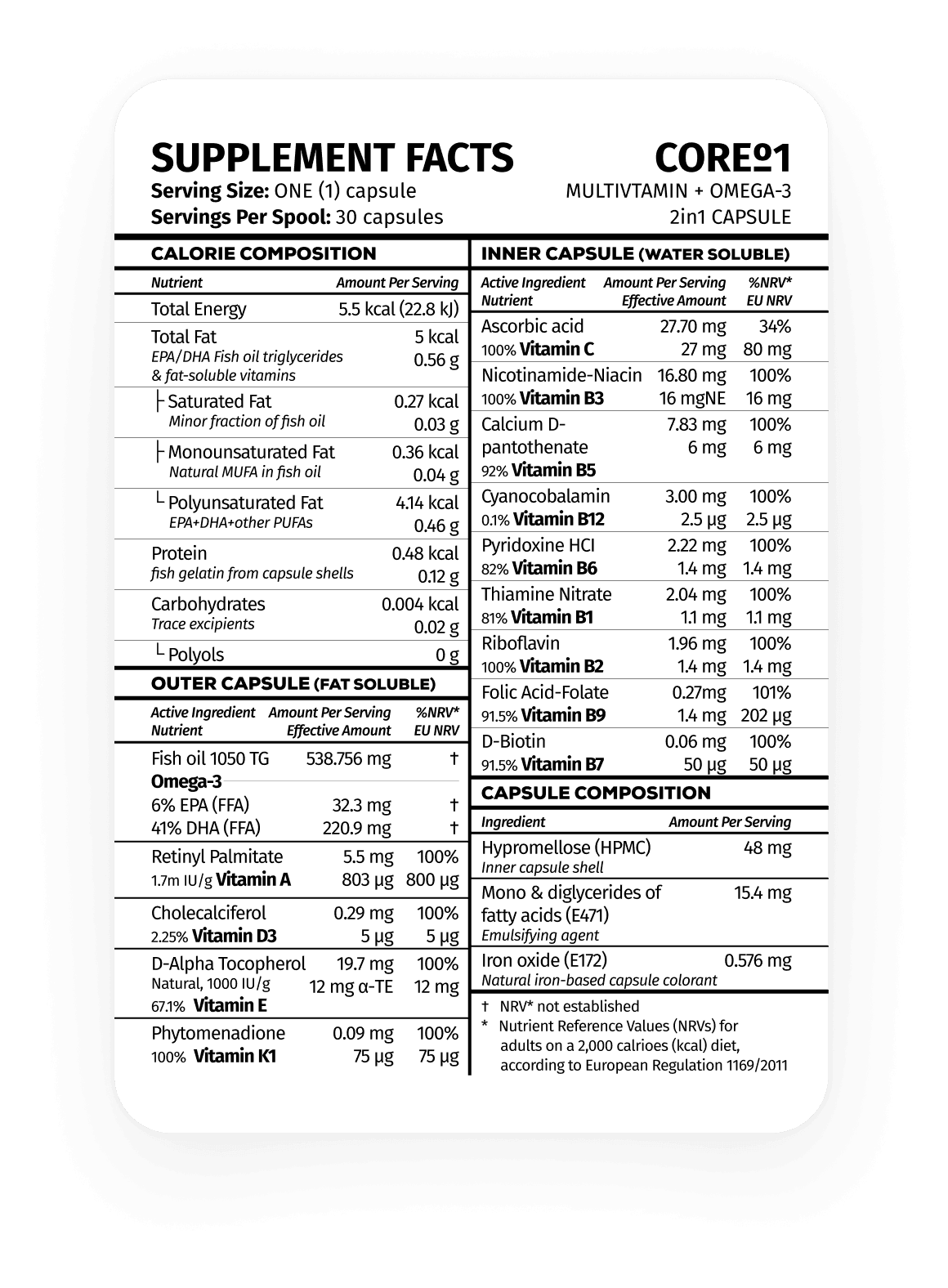 Each ingredient in Core°1 was chosen for one reason: it works. No extras, fakes, or fillers. Just premium ingredients covering 13 essential vitamins and omega-3 fish oil working together to complement your diet.