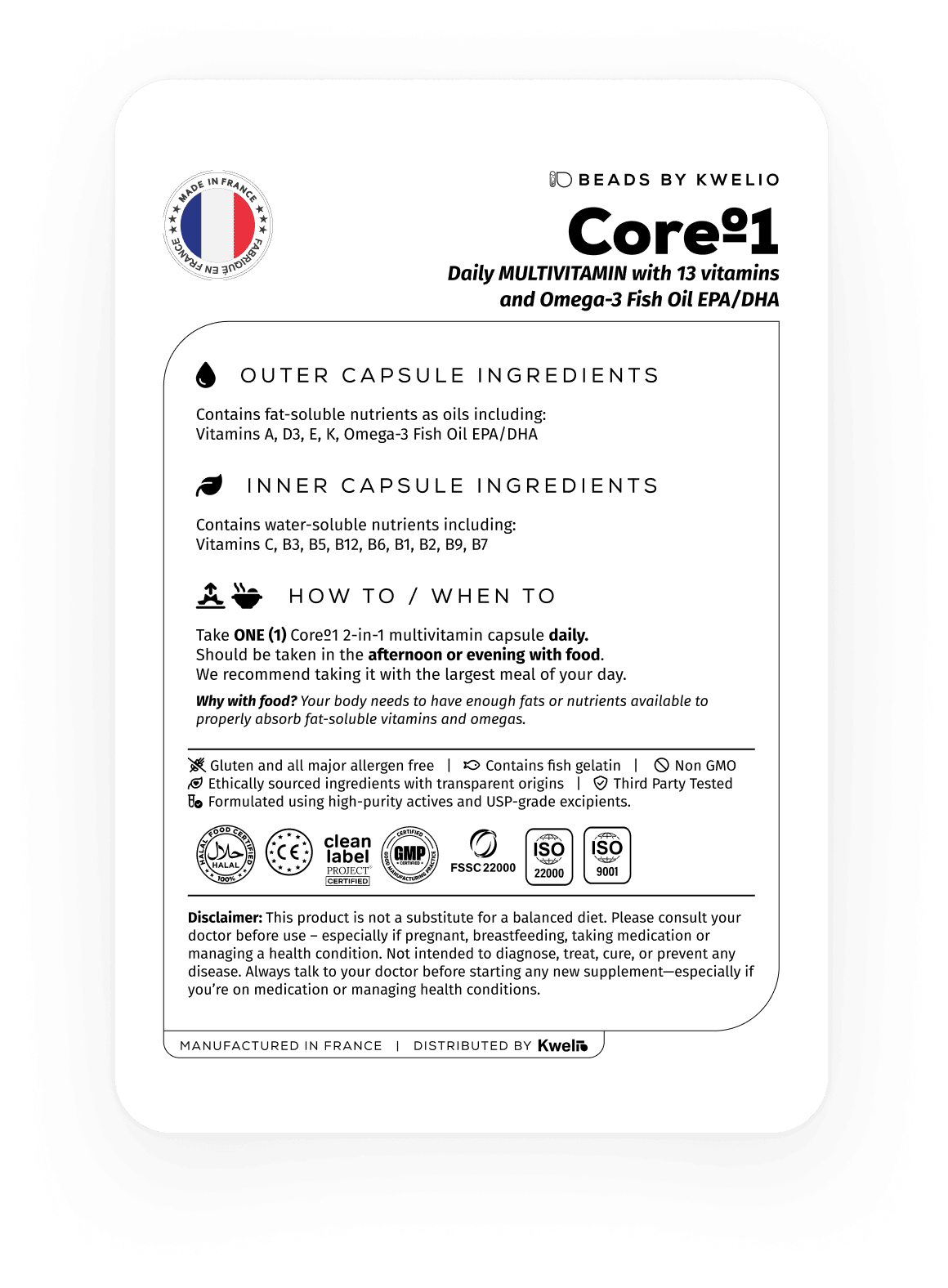 Developed in collaboration with a world-class team of formulation scientists, bioavailability specialists, capsule technologists, and nutritional researchers, Core°1 delivers more than just daily nutrients—it delivers precision. Every ingredient is purpose-selected, clinically aligned, and optimized for absorption through our patented capsule-in-capsule technology. Backed by decades of R&D and pharmaceutical-grade engineering, it’s the multivitamin designed to do exactly what your body needs—nothing more, nothing less